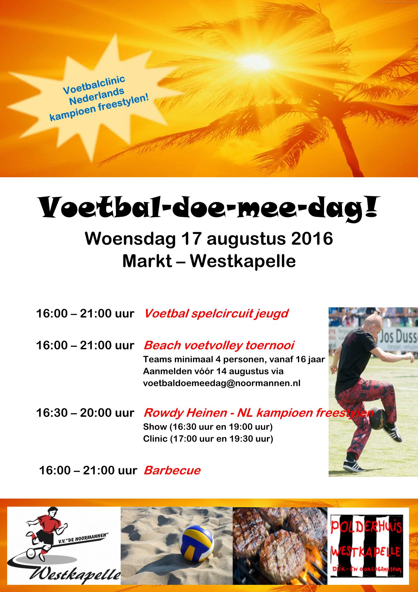 woensdag 17 augustus: voetbal doe mee dag (voetvolley) op de markt te Westkapelle, aanvang 16.00u